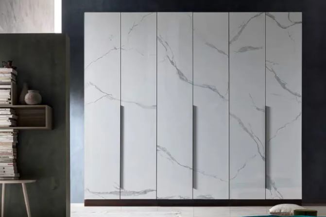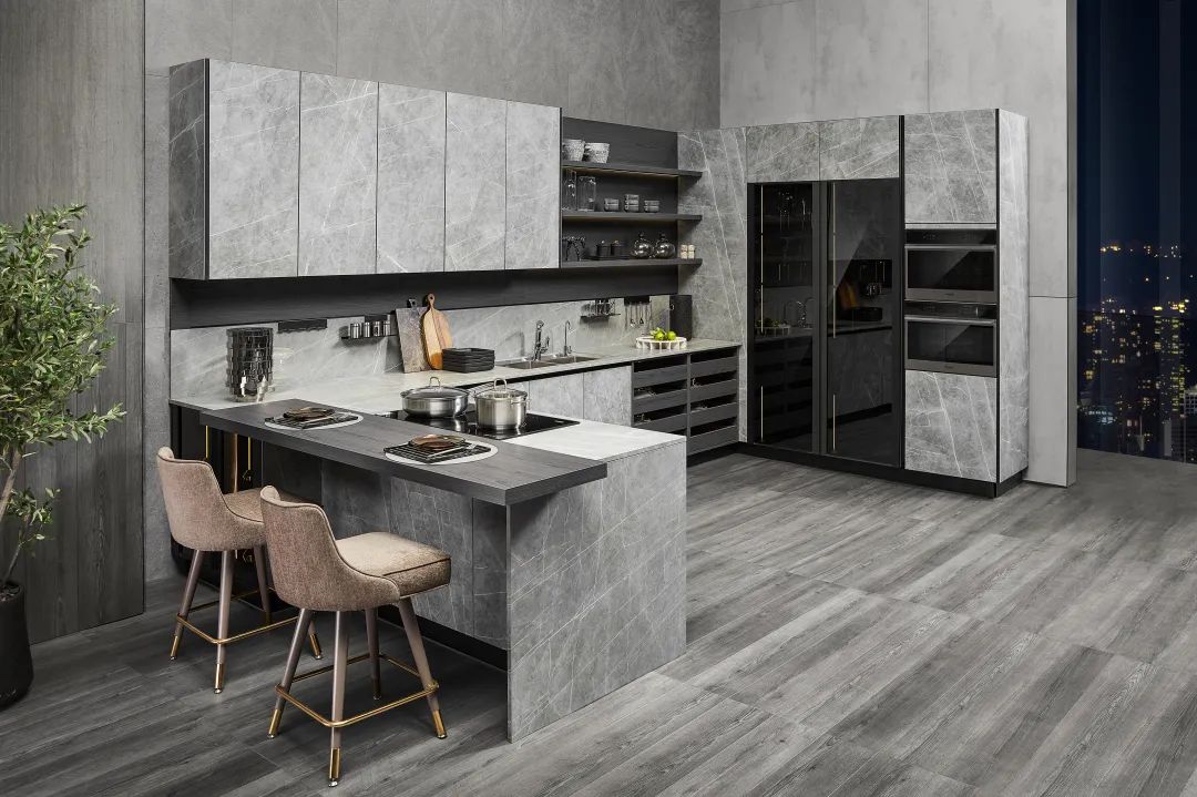 還有在“高定”中風頭無兩的巖板,由于可以做到3mm厚度的工藝突破,近來被大量應(yīng)用在定制家具的飾面中,甚至還推出了“全巖板”家具。巖板的“大薄輕”以及紋理色澤的可塑性、性能的環(huán)保性,都讓其在高端定制中靈活應(yīng)用,彰顯多元的設(shè)計表達。