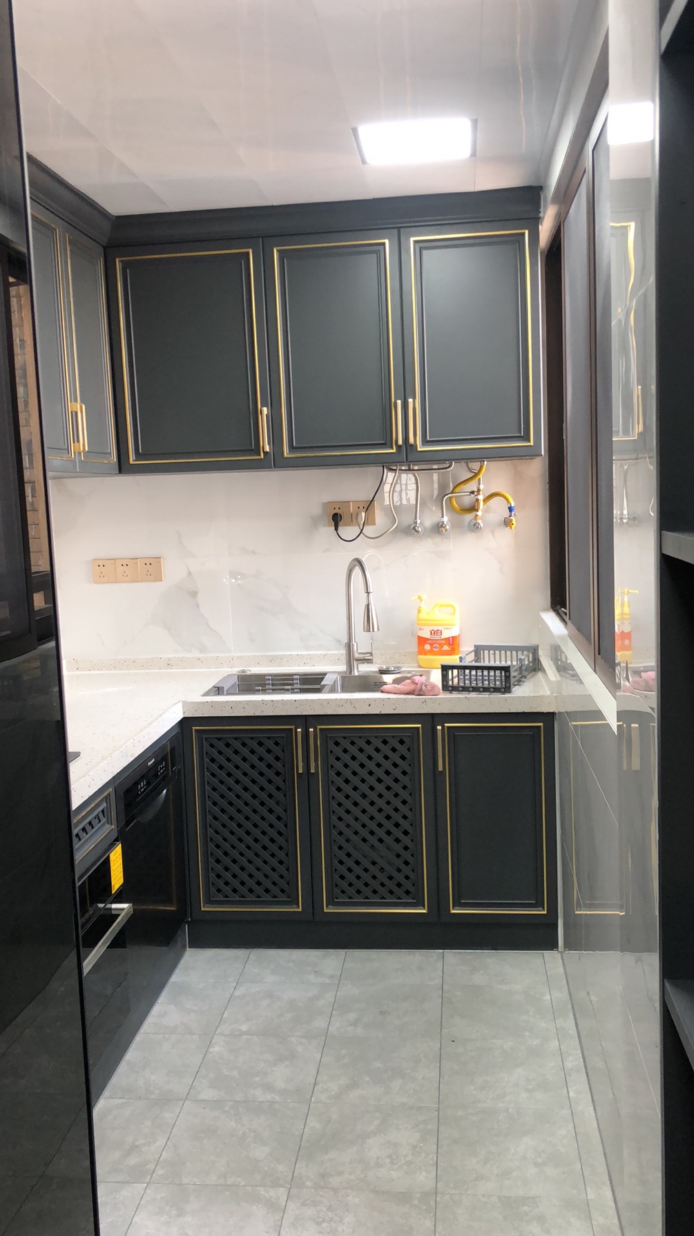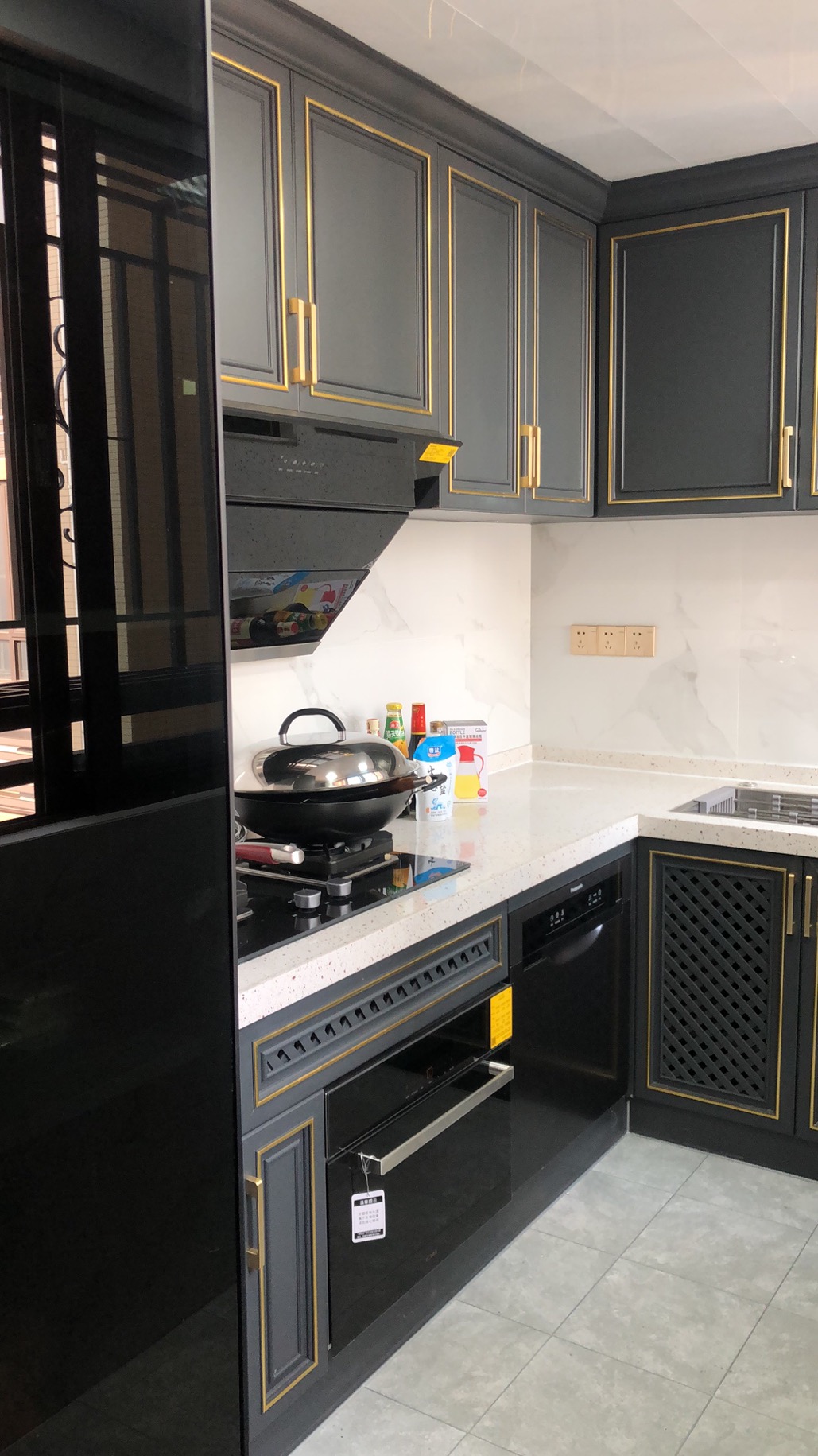 用金色邊框點(diǎn)綴,空間的藝術(shù)氛圍呼之欲出。高級灰廚房打造的視覺效果,并非單一而枯燥,利用材質(zhì)的搭配、燈光的效果、配色的點(diǎn)綴,一樣將高級灰廚房打造地萬種風(fēng)情。